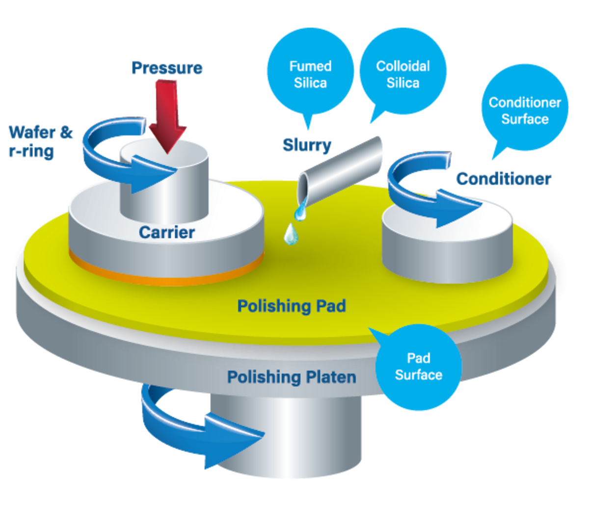 تعتبر CMP عملية تستخدم في تصنيع الشرائح النصفية لإنتاج سطح مستوٍ وموحد على الوافر. تتضمن العملية استخدام وسادة دوارة ومعجون، وهو خليط من المواد الكيميائية والجسيمات الكاشطة. يتم وضع الوافر على الوسادة ثم يتعرض للضغط والحركة، مما يزيل المواد وينتج سطحًا ناعمًا وموحدًا.