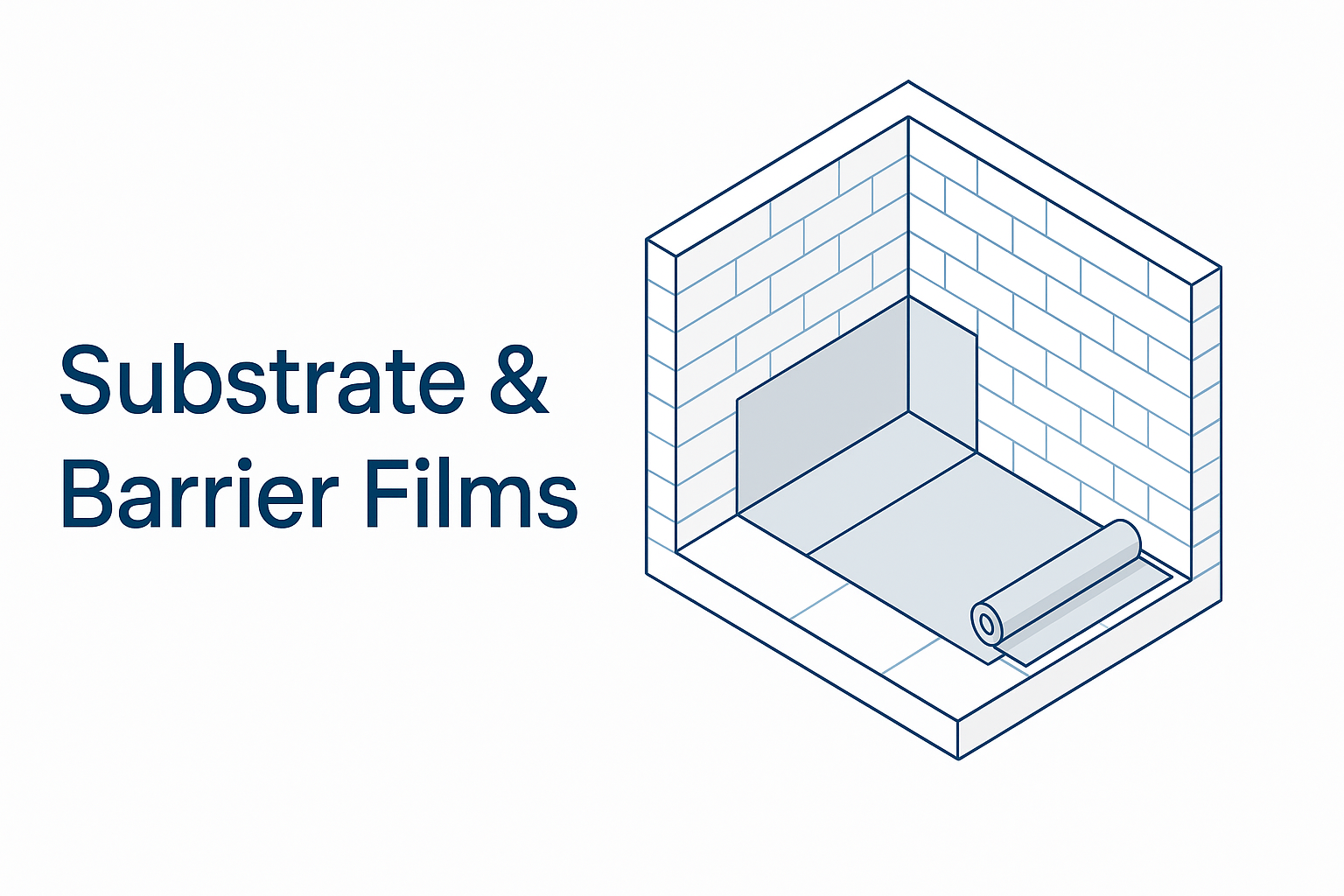 Barrier films designed to prevent moisture intrusion, alkaline migration, and substrate contamination in interior assemblies.